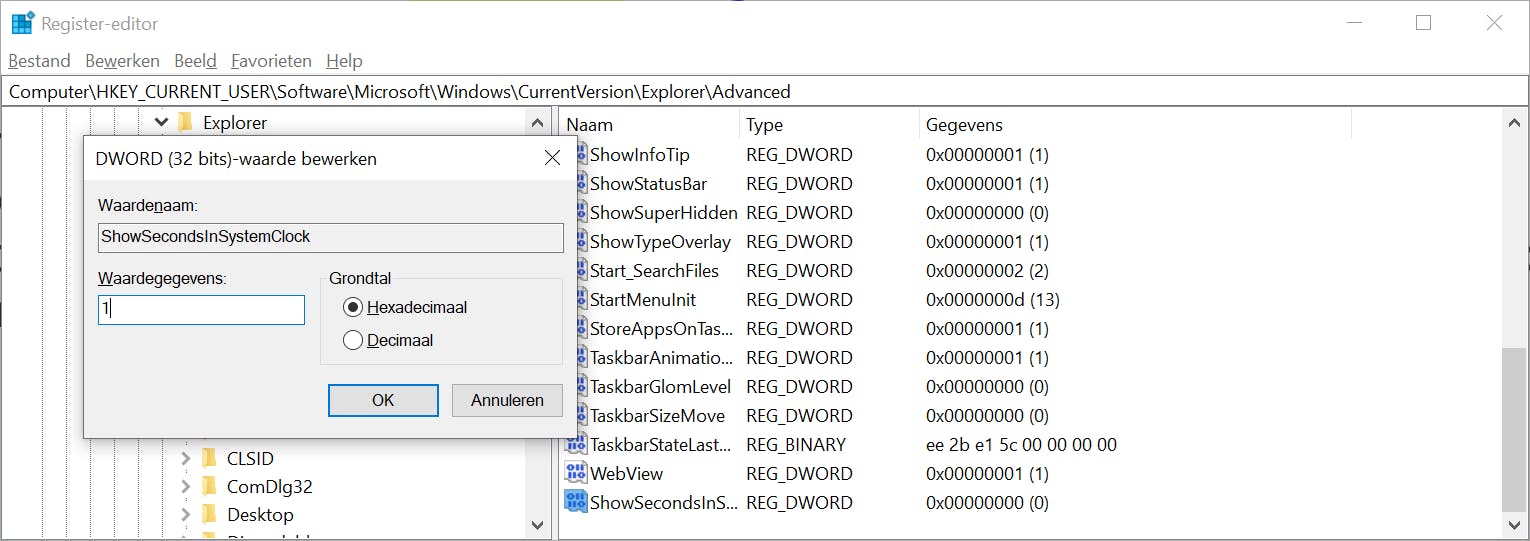 Met deze truc zie je seconden voortaan ook in de systeemklok. Open de sleutel HKEY_CURRENT_USER\SOFTWARE\Microsoft\Windows\CurrentVersion\Explorer\Advanced. Kies Bewerken, Nieuw, DWORD-waarde en noem deze ShowSecondsInSystemClock. Dubbelklik erop en typ 1 in het vak Waardegegevens. Klik op OK en meld je opnieuw aan bij Windows. De seconden zijn voortaan zichtbaar.