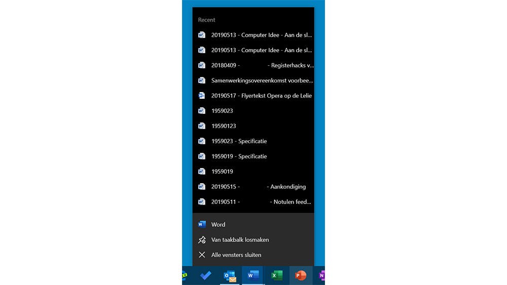 Sommige programma’s bieden de mogelijkheid om snel recente items te openen: klik je bijvoorbeeld op de taakbalkknop van Word, dan zie je een lijst met 12 recent geopende documenten.