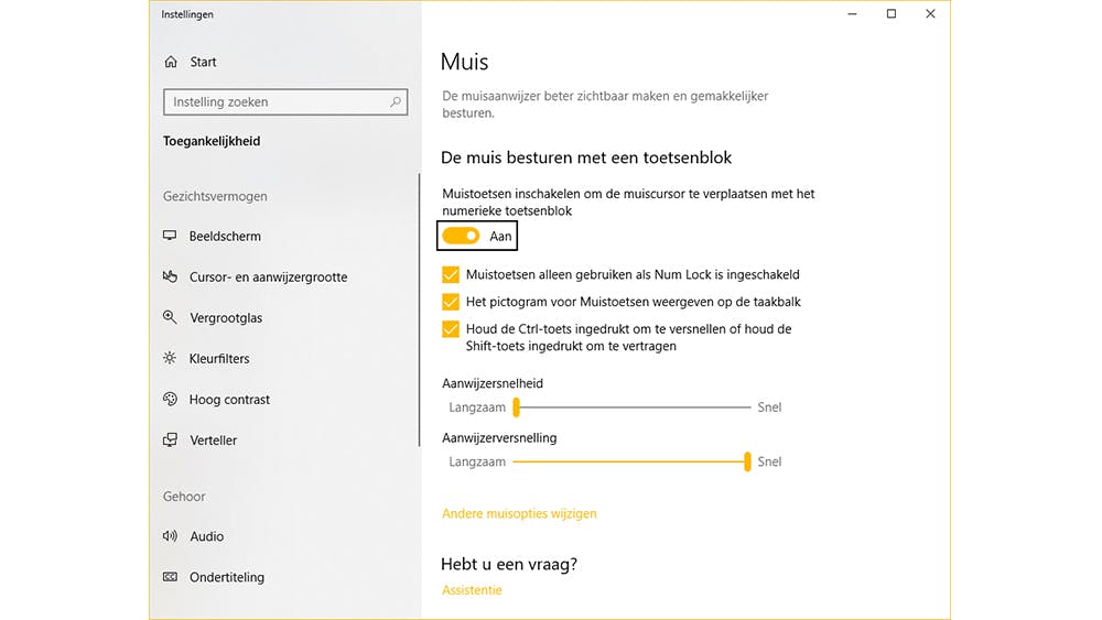 Wanneer we zeggen dat Windows volledig met het toetsenbord bestuurd kan worden, dan zijn er altijd mensen die heel bijdehand toevoegen: “Maar de muisaanwijzer kun je niet besturen met het toetsenbord”. Dat is dus onzin, want dat kan wel degelijk. Wanneer je op de Windows-toets drukt en de zoekterm Muis invoert, dan zie je de optie De muis besturen met een toetsenblok. Wanneer je dit menu opent en je schakelt de optie in, dan kun je de pijltoetsen op je toetsenbord gebruiken om de muisaanwijzer te besturen.