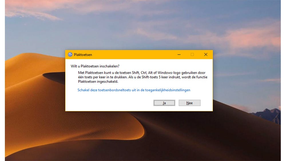 Hierbij hoef je toetsen niet ingedrukt te houden, maar onthoudt Windows welke toets (voorbehouden aan Shift, Ctrl, Alt of de Windows-toets) je hebt ingedrukt, zodat je eenvoudig combinaties kunt maken. Het enige dat je hoeft te doen om plaktoetsen te activeren is vijf keer achter elkaar op de Shift-toets te drukken en vervolgens te klikken op Ja als Windows u vraagt of plaktoetsen ingeschakeld moeten worden.
