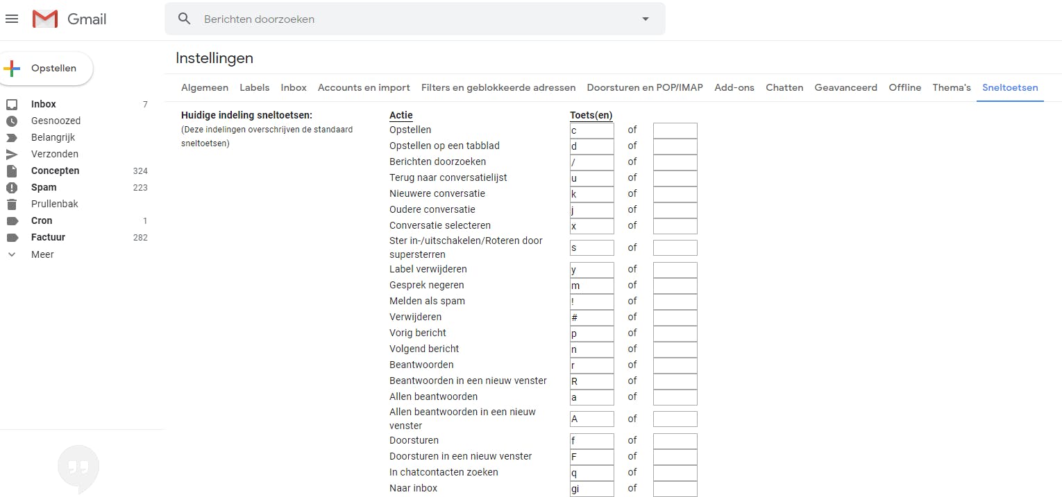 Wanneer je sneltoetsen hebt ingeschakeld in het tabblad Algemeen in de instellingen, dan verschijnt er aan de rechterkant een tabblad Sneltoetsen. Wanneer je hierop klikt, kun je je eigen sneltoetsen instellen.