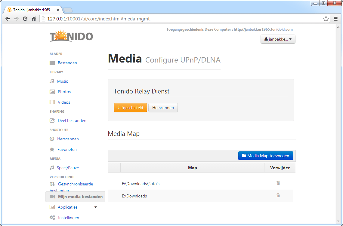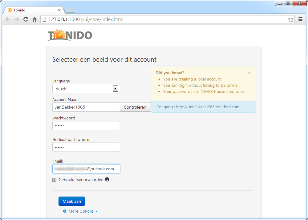 Tonido werkt alleen wanneer u een lokaal account creëert.