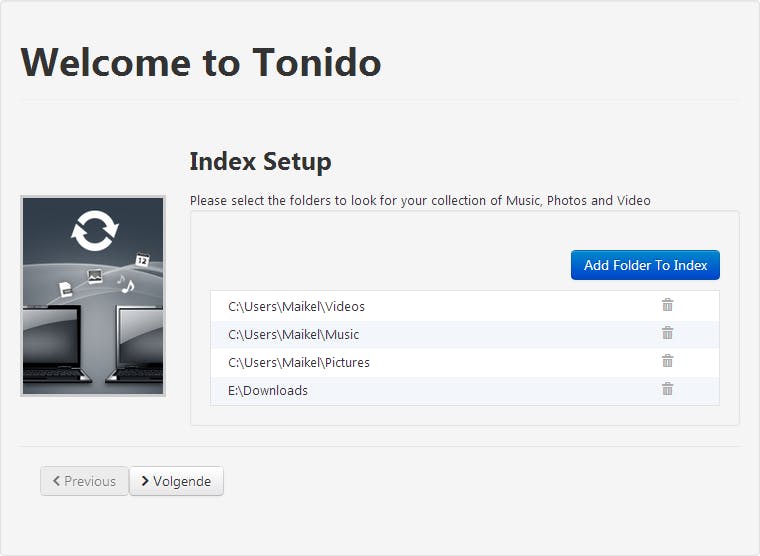 Tonido brengt als eerste uw mediacollectie in kaart. U geeft daarom aan in welke mappen foto’s, muziek en films staan opgeslagen. Hiervoor gebruikt u de knop Add Folder To Index, waarna u met Selecteer de juiste map uitkiest (afbeelding 2). Via het pictogram met de vuilemmer verwijdert u eventueel de standaardmappen. Klik daarna op Volgende. Tonido wijst u erop dat er apps voor iOS, Android, Windows Phone en BlackBerry beschikbaar zijn. Hierop komen we later uitgebreid terug. Sluit het venster en kijk eens rond om alvast aan de webinterface van Tonido te wennen.