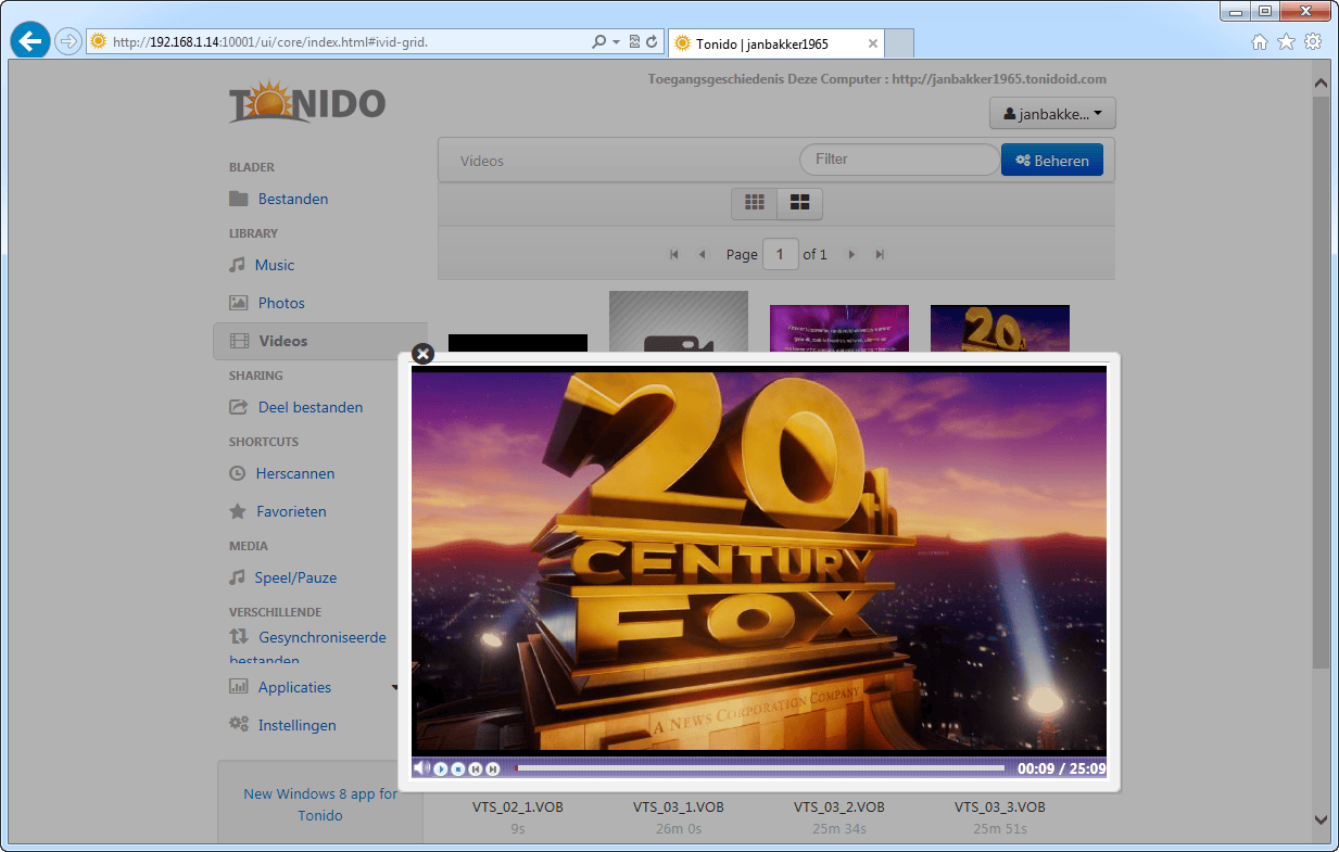 Tonido gooit niet zomaar alle bestanden van uw thuis-pc op een berg. U hebt eerder aangegeven in welke mappen uw mediabestanden staan opgeslagen. In de webinterface vindt u ze terug in de bibliotheken Music, Photos en Videos. U streamt over het web gemakkelijk mediabestanden vanaf uw persoonlijke cloudserver naar een ander apparaat (afbeelding 4). Muziek en films speelt u in verschillende formaten direct af binnen een browser. U hebt geen last van wachttijden, omdat het niet nodig is om eerst audio- en videobestanden te downloaden. Tonido accepteert onder meer de formaten mp3, flac, mov, avi, mp4, m2ts, mkv, vob en flv. Vindt u niet alle mediabestanden terug in de bibliotheken? Geen probleem, want u laat Tonido gemakkelijk zoeken naar onlangs toegevoegde films en muziekalbums. Klik hiervoor rechtsboven op uw profielnaam en navigeer naar Instellingen. Kies daarna bovenaan voor Verschillende. Via de knop Index Now zoekt de webdienst op uw cloudserver naar verse mediabestanden, waarna ze vanzelf in de bibliotheken opduiken.