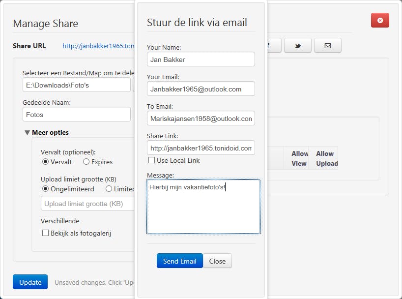 Vanuit Tonido deelt u rechtstreeks bestanden met vrienden via e-mail.