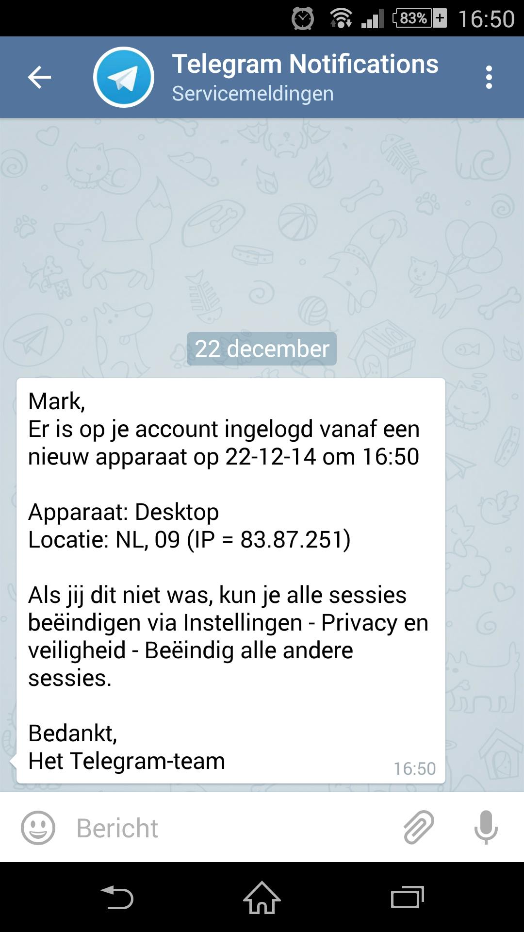 Zodra je op de pc Telegram hebt geactiveerd, ontvang je op je smartphone een Telegram-bericht, waarin je wordt geattendeerd op het feit dat de software op een ander systeem is geregistreerd.