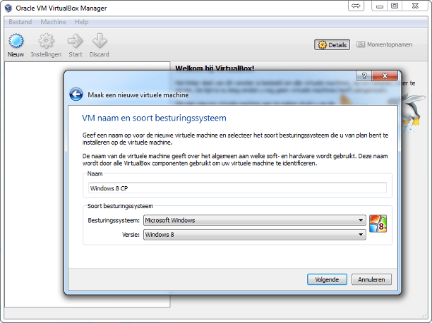 Start VirtualBox en klik op de knop Nieuw. Ga naar Volgende, geef een logische naam bijvoorbeeld: Windows 8 CP, selecteer bij Besturingssysteem Microsoft Windows en bij Versie Windows 8. Kies voor minimaal 1024 MB geheugen (2048 MB bij 64 bit). Ga naar Volgende en selecteer Opstart harde schijf en Maak een nieuwe harde schijf aan. Neem achtereenvolgend de volgende instellingen over: VDI (Virtual Disk Image) / Dynamically allocated / 20 GB harde-schijfruimte en kies Create.