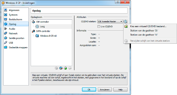 Vervolgens stellen we de virtuele dvd-speler in door het iso-bestand te koppelen. Ga naar de instellingen via de knop Instellingen en open Opslag. Selecteer het cd/dvd-station en klik op de knop Zet een virtueel CD/DVD station op. Klik op Kies een virtueel CD/DVD bestand en open het iso-bestand met Windows 8 Consumer Preview (zie het kader 'Windows 8 downloaden'). Hebt al een installatieschijf gebrand, dan kan hier ook het juiste station gekozen worden. Kies dan niet voor een virtueel cd/dvd-station, maar voor het juiste Station van de gastheer.