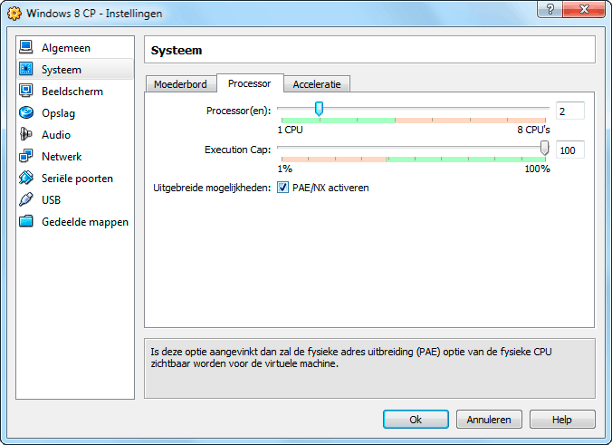 Als de computer over 4 GB of meer geheugen beschikt, is het nodig om bij Instellingen / Systeem / Processor de optie PAE/NX activeren in te schakelen. Zo kan het systeem gebruikmaken van de uitgebreide geheugenadresseringen. Zorg ook dat bij Systeem / Moederbord de optie IO APIC activeren aan staat en bij Acceleratie de opties VT-x/AMD-V activeren en Geneste Paging activeren. Overige instellingen die u kunt wijzigen zijn de omvang van het videogeheugen, 3D-acceleratie, netwerkinstellingen, gekoppelde usb-apparaten en gedeelde mappen.
