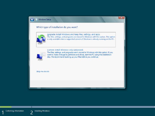 Bepaal eerst wat voor installatie u wilt. Voor een dualboot-systeem dient eerst de partitie ingesteld te zijn of een tweede harde schijf aangesloten te zijn. Zorg voor minimaal 20 GB ruimte op de partitie voor Windows 8. Zorg dat het BIOS zo is ingesteld dat de pc van cd of dvd opstart. Start de computer met de dvd in het station. Zodra de melding Press any key to boot from CD or DVD verschijnt, drukt u op een toets. Verschijnt de vraag niet, controleer dan de BIOS-instellingen nog eens.