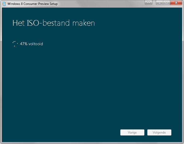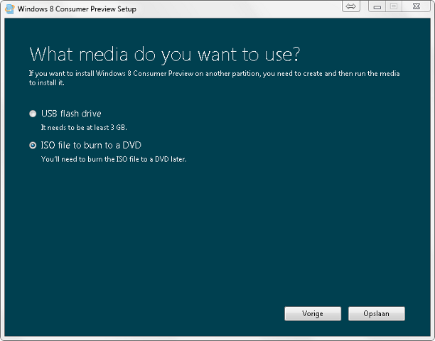 Een iso-bestand maken via de Windows 8 Consumer Preview Setup gaat als volgt: download het programma van de website en start het op. Kies Install on another partition en klik op Volgende. Selecteer de optie ISO file to burn to a DVD en klik op de knop Opslaan. Kies de locatie voor het iso-bestand en klik op Opslaan. Na het kopiëren krijgt u de productcode te zien. Klik op Voltooien om af te sluiten en het bestand op dvd te branden of te gebruiken voor een virtuele machine.