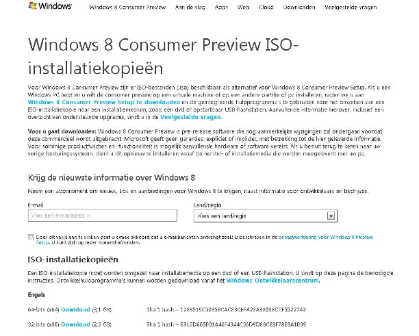 Op 29 februari 2012 was het eindelijk zover: Windows 8 Consumer Preview werd officieel aan het publiek vrijgegeven. Om zelf Windows 8 te bemachtigen gaat u naar Microsoft.com. Klik op Nu downloaden en op Download Windows 8 Consumer Preview voor het setup-bestand. Klik op ISO-bestand als u de iso-bestanden wilt downloaden. Op de volgende pagina kunt u een gewenste versie van Windows 8 downloaden. Helaas is er nog geen Nederlandstalige Windows 8 beschikbaar.