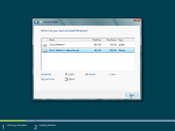 Gaat u voor een schone installatie op bijvoorbeeld een hobby- of test-machine, klik dan na stap 18 op de schijf die leeg gemaakt mag worden. Staat er nog een besturingssysteem op, dan kunt u via de optie Format de schijf formatteren. Als u de schijf in partities wilt delen, dan klikt u op Delete. Kies New, geef de omvang van de partitie aan en kies Apply. Selecteer de partitie of schijf waarop Windows geïnstalleerd moet worden en klik op Next om de installatie te starten.