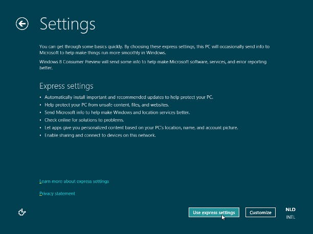 Zodra de installatie klaar is, zal Windows 8 starten en vragen om nog wat instellingen op te geven. Geef de machine een naam en klik op Next. Druk op de knop Use Express settings (voor uitgebreide installatie-opties kiest u Customize). Vul uw Windows Live e-mailadres in en klik op Next (of doorloop de optie bij Geen Windows Live). Geef vervolgens het wachtwoord op, klik op Next en vul eventueel de gegevens aan. Klik op de knop Next en uw account wordt aangemaakt.