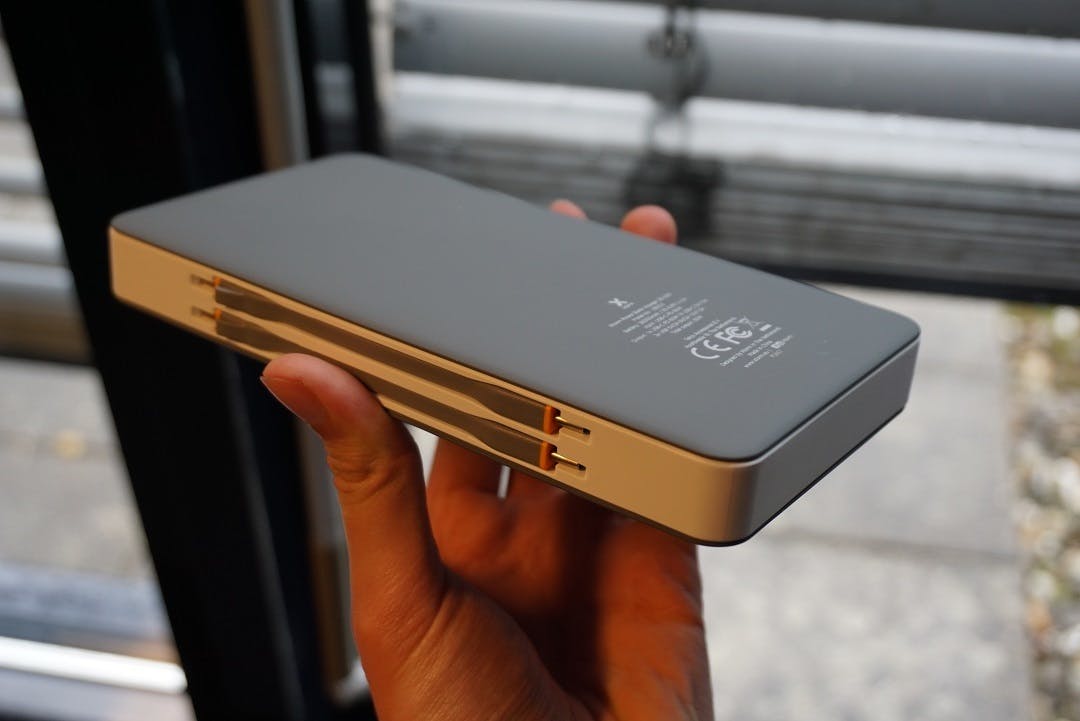 De powerbank heeft een kunststof behuizing met matte rubberen afwerking en voelt degelijk aan. Op de linkerzijkant zit een knop die na een druk een kleine led-strip bovenop laat oplichten. Zo zie je direct hoeveel stroom de accu ruwweg nog heeft. In de andere zijkant zit een uitsparing waar twee usb-c-naar-usb-c-kabeltjes in geplaatst zijn. Die haal je er eenvoudig uit. Ik ben aardig te spreken over deze ontwerpkeuze: je hebt nu altijd twee kabeltjes bij de hand om je usb-c-apparatuur op te laden. Nadeel is dat de kabeltjes erg kort zijn en erg stevig zijn; ze buigen vanzelf terug naar de rechte vorm. Zelf vind ik het handig dat beide kabels usb-c-naar-usb-c zijn, al kan ik me voorstellen dat sommigen liever ook een kabeltje met Apple lightning- of micro-usb-connector hebben. Met oog op de toekomst is usb-c echter de beste keuze.