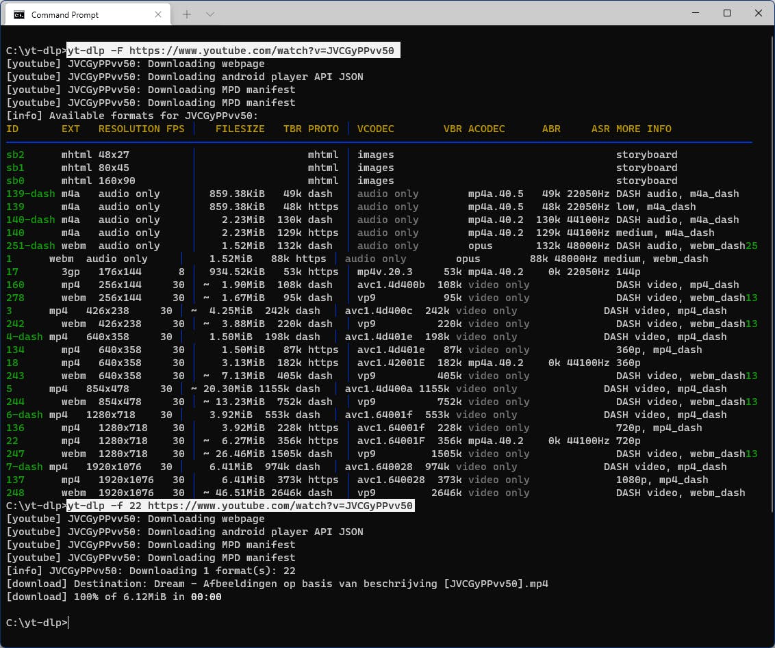 Er zijn trouwens nog veel meer mogelijkheden, zoals duidelijk wordt uit de opdracht: yt-dlp.exe -h.