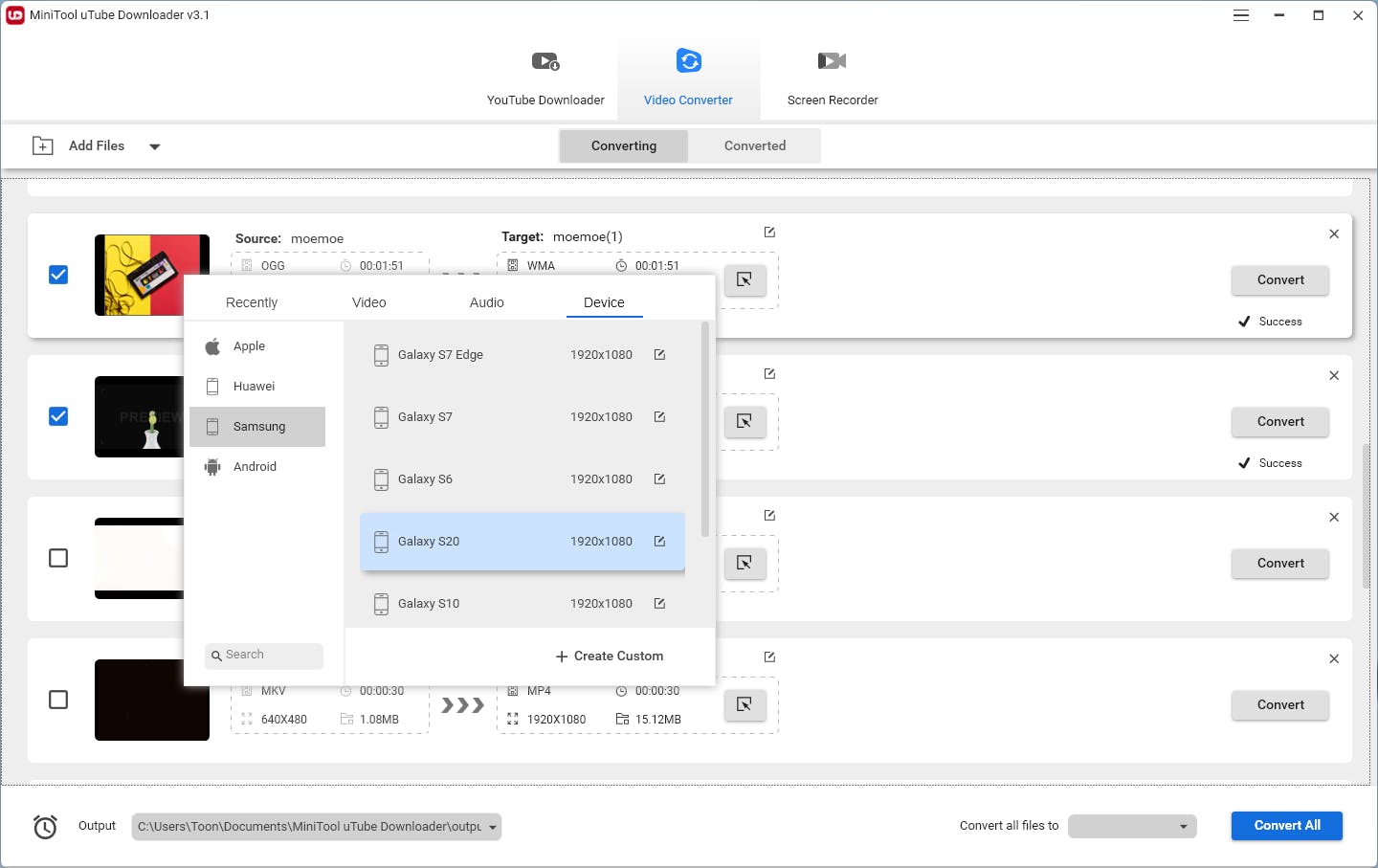 Maar uTube Downloader heeft precies zo’n conversiemodule aan boord. Druk bovenaan op de knop Video Converter en klik op Add Files, of (via het pijlknopje) op Add Folder, om een of meer mediabestanden te importeren. De video’s worden toegevoegd, netjes inclusief miniatuurweergave, formaat, resolutie en duurtijd.