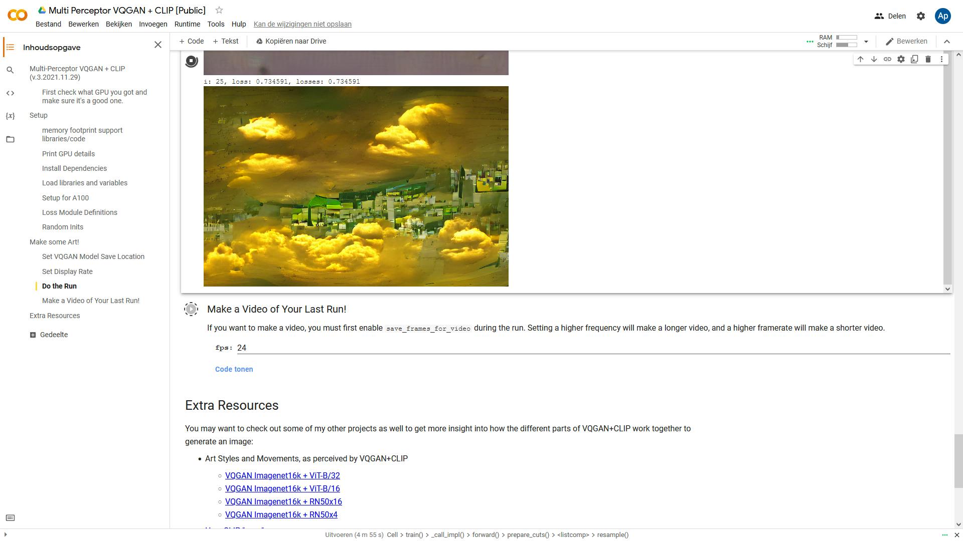 Op https://softologyblog.wordpress.com vind je links naar Colab-versies van vrijwel alle scripts die ook in Visions of Chaos beschikbaar zijn. Als voorbeeld gaan we naar het script voor Multi-Perceptor VQGAN+CLIP v3.