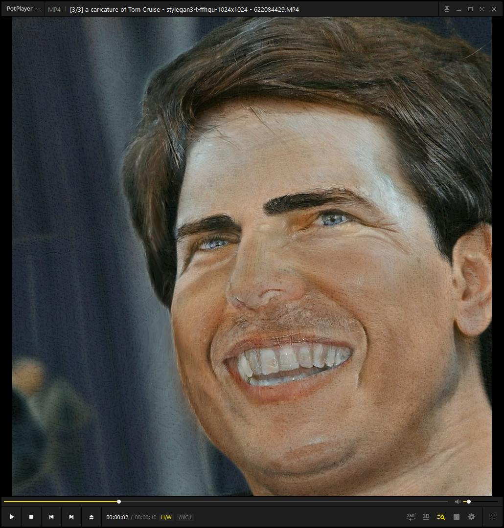 In het vrijwel oneindige domein van alle mogelijke gezichten heeft de opgegeven instructie het oorspronkelijke portret nu in iets totaal anders veranderd. Genereer je een video, dan zal StyleGAN3 voor het gekozen model beelden in elkaar laten overvloeien (in ons geval gezichten), wat herinnert aan het aloude ‘morphing’, maar dan automatisch en veel vloeiender. Gebruik je CLIP in combinatie met video, dan start deze met een willekeurig portret en zie je hoe dit verandert in iets dat hopelijk voldoet aan de gegeven opdracht. Probeer bijvoorbeeld ‘a caricature of Tom Cruise’. Na het genereren van de beeldjes krijg je een FFmpeg-venster te zien waarmee je ze kunt combineren tot video. Je hebt hier veel bewerkingsmogelijkheden waar we hier niet op in kunnen gaan. Klik voor nu op Build en hoop op de gewenste karikatuur.
