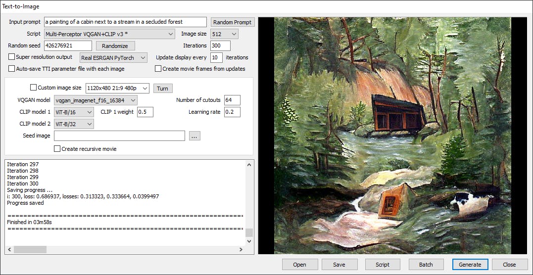 Als voorbeeld gaan we aan de slag met Multi-Perceptor VQGAN+CLIP v3. Hierin worden de gemaakte afbeeldingen beoordeeld door twee verschillende CLIP-modellen voor meer betrouwbaarheid. Laat de standaard inputprompt voor wat hij is en klik op Generate om je eerste TTI-kunstwerk te produceren. Het eindresultaat laat enkele minuten op zich wachten waarbij het beeld tussentijds steeds wordt bijgewerkt. Je kunt het proces overigens versnellen door vooraf Number of cutouts bijvoorbeeld te halveren.