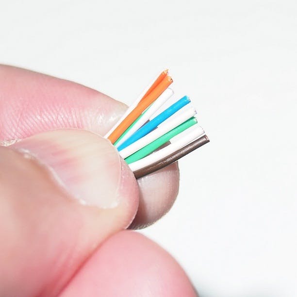Waarschijnlijk het eenvoudigste van het hele proces is het strippen van de ethernetkabel. Je ziet aan de zijkant van de UTP-tang twee mesjes zitten. Daar plaats je je kabel tussen, knijpt de tang samen (niet te hard anders knip je hem volledig door) en trekt de kabel er tussenuit. Je ziet nu verschillende kleuren kleinere kabeltjes.