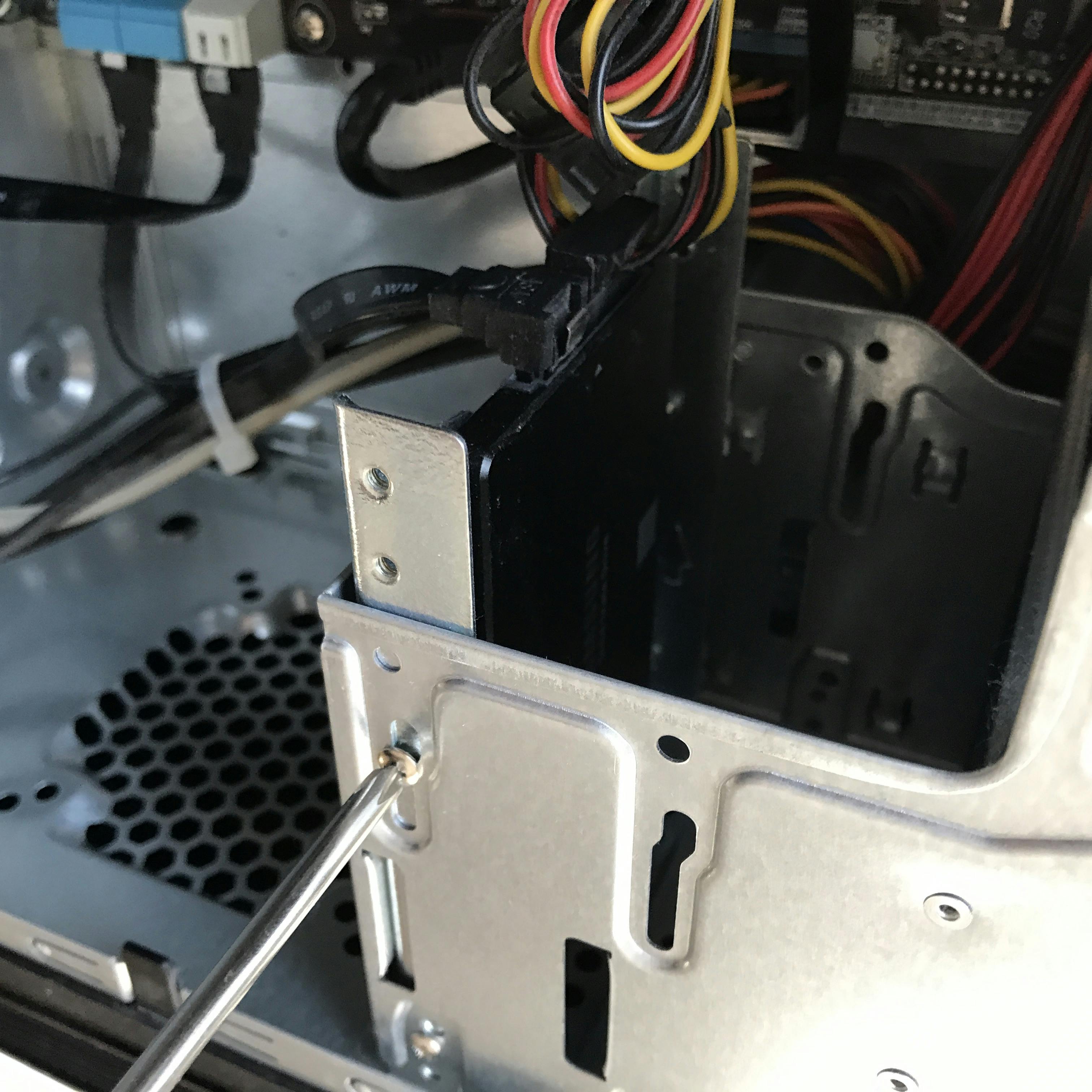Voor het vervangen van je harde schijf geldt eigenlijk hetzelfde als voor het openen van je systeemkast: kijk goed hoe alles in elkaar zit en met welke schroefjes je de schijf kunt losmaken. Als je dat eenmaal hebt gedaan, kun je de harde schijf er doorgaans eenvoudig uitschuiven. Kijk goed hoe de connectoren aan de achterkant vastzitten, al wijst dat zich met SATA tegenwoordig vanzelf. Als je een schijf hebt gekocht van hetzelfde type als de schijf die er al in zat, dan is het een kwestie van eruit schuiven, stekkers uit de oude schijf, in de nieuwe schijf, terug schuiven en schroeven weer vast. Stap je echter over van een harde schijf naar een SSD (of een compactere harde schijf), dan kan het zijn dat je de schijf moet bevestigen met een slede. Geen zorgen, je krijgt bij zo’n schijf vaak een handleiding. Maar zelfs als dat niet zo is, is het simpelweg een kwestie van de schijf in de slede vastschroeven en de slede vervolgens in de sleuf schuiven waar je oude schijf uit kwam. Het belangrijkst is dat de schijf goed vastzit.