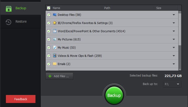Sluit de externe harde schijf aan op je oude computer. Download en start IObit PCtransfer via www.iobit.com op je oude computer. Het programma toont twee tabbladen: Backup en Restore. Zorg dat het tabblad Backup actief is. Vink de onderdelen en bestanden aan die je wilt overzetten. Mis je bepaalde mappen? Voeg ze handmatig toe met Add files.