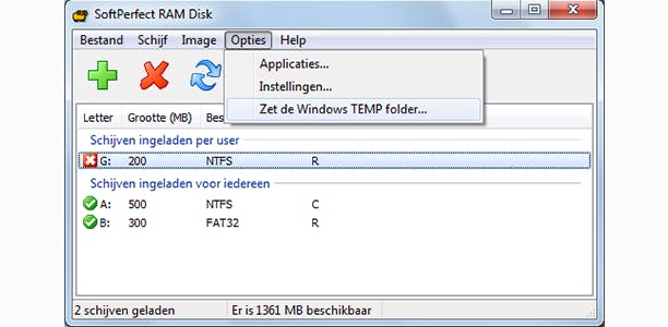 Je krijgt een overzicht van je virtuele RAM-schijven. In het menu betekent de instelling Zet de Windows TEMP folder dat de tijdelijke bestanden naar de RAM-schijf geschreven zullen worden.