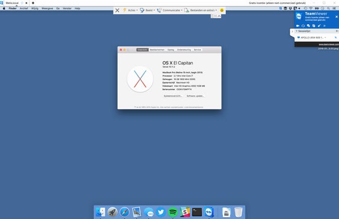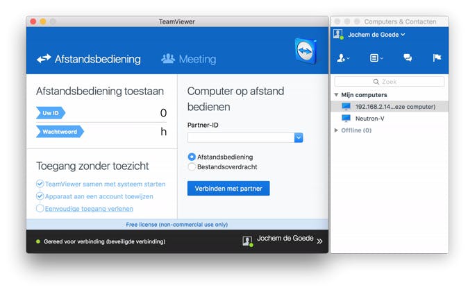 Op de pc waarmee je verbinding wilt maken, download je opnieuw TeamViewer vanaf www.teamviewer.com. In dit geval maken wij verbinding met OS X, dus downloaden we de software voor dit besturingssysteem. Open het dmg-bestand en start de installatie. Klik op Ga door en daarna nogmaals, gevolgd door Akkoord en Installeer. Voer je wachtwoord in om door te gaan. De opstartwizard verschijnt. Klik op Doorgaan. Voer een wachtwoord in om de computer mee te beschermen voor TeamViewer en klik opnieuw op Doorgaan / Voltooien. TeamViewer opent zich nu. Vul rechts je gebruikersnaam en wachtwoord in en klik op Aanmelden. Om te verbinden, klik je links op Apparaat aan een account toewijzen en daarna op Toewijzen. Klik daarna op Eenvoudige toegang verlenen. Om te verbinden, open je TeamViewer op Windows 10 en klik je op de pc waarmee je wilt verbinden bij Mijn computers.