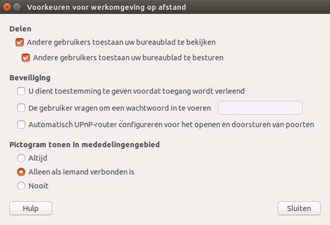 Hoewel TeamViewer ook werkt voor Linux, is VNC toch meer de standaard voor Linux-systemen. Het is altijd al aanwezig op Ubuntu-systemen, zodat je zo'n systeem gemakkelijk beschikbaar maakt om vanaf andere computers te bereiken. VNC is opensource, wat gebruikers van Linux fijn zullen vinden. Wij gebruiken voor deze uitleg Ubuntu 15.10, de recentste versie van Ubuntu, maar de stappen zouden ook moeten werken met versie 14.04. In Ubuntu klik in de Unity-balk links op de Ubuntu-knop (de bovenste knop) en open je het programma Werkomgeving delen door daarop te zoeken. Open het programma en vink de optie aan Andere gebruikers toestaan uw bureaublad te bekijken. Laat de overige opties zoals ze zijn, behalve de optie U dient toestemming te geven voordat toegang wordt verleend, die je uit kunt vinken. Klik op Sluiten, want er is hier nu genoeg geconfigureerd.