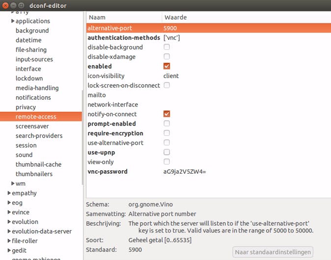 Voer het volgende commando in: sudo apt-get install dconf-tools. Druk op J als gevraagd wordt om de installatie voort te zetten en daarna op Enter. Na de installatie voer je het commando dconf-editor in en druk je op Enter. Er opent zich een nieuw venster, enigszins vergelijkbaar met de register-editor op Windows. Blader naar de volgende sleutel: org / gnome / desktop / remote-access. Klik rechts bij require-encryption op het selectievakje zodat dit niet langer ingeschakeld is. Sluit het venster daarna om de wijzigingen direct actief te maken.