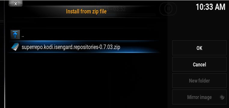 In de repofolder blader je nu naar de map /repositories/superrepo. Je ziet in die map nu een zipbestand staan, genaamd superrepo.kodi.isenguard.repositories.0.7.03.zip