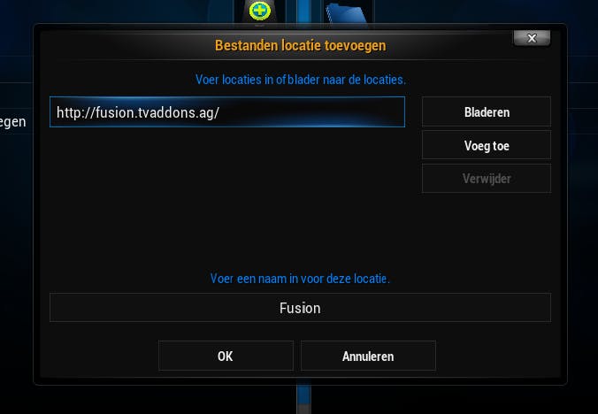 Geef nu bij de locatie het volgende webadres op, inclusief alle tekens: http://fusion.tvaddons.ag . Geef de nieuwe locatie vervolgens een naam en klik op OK om de wijzigingen op te slaan. Nu moet je vanaf de ingevoerde repo-website de daadwerkelijke add-on downloaden. Keer daarvoor terug naar het hoofdscherm en ga naar Systeem (System), Instellingen (Settings) en Add-ons en vervolgens Installeren van zipbestand. Je krijgt vervolgens een lijst met opslaglocaties, zowel lokaal als van je thuisnetwerk. In het rijtje komt ook de eerder ingevoerde repo-site tevoorschijn, in ons voorbeeld is dat Fusion.