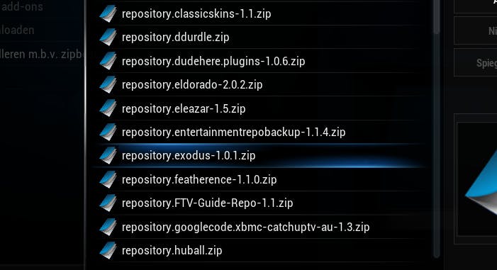 Klik op de repo-site, waarna je een site-structuur te zien krijgt. Vanuit hier kun je Exodus downloaden en installeren. De Exodus-repo vind je op deze locatie: xbmc-repos > english > repository.exodus-1.0.1.zip. Exodus wordt regelmatig bijgewerkt, dus het kan zijn dat er op jouw systeem inmiddeld een nieuwere versie beschikbaar is. In dat geval zullen de laatste cijfers gewijzigd zijn.