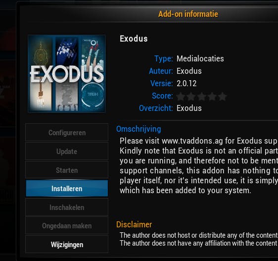 Selecteer Exodus en kies in het daarop volgende scherm vervolgens voor Video add-ons > Exodus. Er wordt een nieuw scherm geopend, waarvanuit je de Exodus video-add-on nu kunt installeren. Klik op de knop Installeren om de Exodus video-add-on te installeren. Rechts onder in beeld krijg je een melding te zien wanneer de add-on is geïnstalleerd.