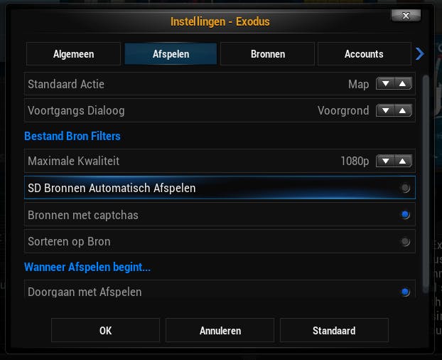 Nadat de Exodus-repo is geïnstalleerd, kun je deze - indien gewenst - nog verder configureren. Op zich is dat niet nodig, want de add-in werkt eigenlijk meteen al goed. Wel kun je eventueel wat extra opties instellen, zoals de voorkeur voor videokwaliteit (variabel van 1080p naar 480p) en de mogelijkheid tot het alleen streamen van video's die zijn voorzien van ondertitels. Ook kun je de lijst met bronnen bewerken, maar hoe meer bronnen je gebruikt, des te groter is de kans dat je de beste kwaliteit vindt voor je film of tv-serie.