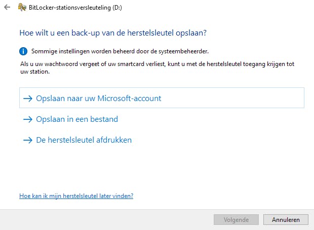 Windows maakt automatisch een herstelsleutel aan als je het wachtwoord bent vergeten. Je kunt die herstelsleutel op drie manieren vastleggen: je kunt hem opslaan in je Microsoft-account, in een tekstbestand ergens op de harde schijf of afdrukken. Kies een van de drie manieren en klik op Volgende. Nadat je het bericht hebt ontvangen dat de herstelsleutel is opgeslagen of afgedrukt, ga je verder.