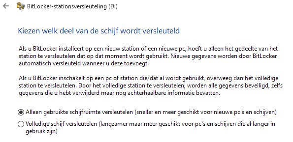BitLocker vraagt welk deel van de externe gegevensdrager beveiligd moet worden. Als het gaat om een nieuwe schijf of usb-stick, dan hoef je alleen het gedeelte van het station te versleutelen dat je op dat moment gebruikt. Alle nieuwe gegevens zal BitLocker automatisch versleutelen wanneer je ze naar dit station wegschrijft. Dit is de snelste methode. Afhankelijk van de hoeveelheid gegevens op de schijf een paar seconden tot minuten.
