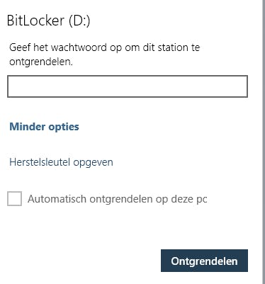 Wanneer je later de schijf of usb-stick verwijdert en opnieuw in de computer plugt, verschijnt er een pop-upvenster van BitLocker die naar het wachtwoord vraagt. In het pop-upvenster zie je ook nog twee andere opties: het opgeven van de herstelsleutel en de schijf automatisch laten ontgrendelen op de pc. De eerste optie gebruik je als je je wachtwoord vergeten bent, je voert dan de herstelsleutel van 48 tekens in om weer toegang tot je schijf te krijgen. Door de tweede optie aan te vinken zorg je ervoor dat de huidige pc de schijf altijd automatisch herkent en ontgrendelt.