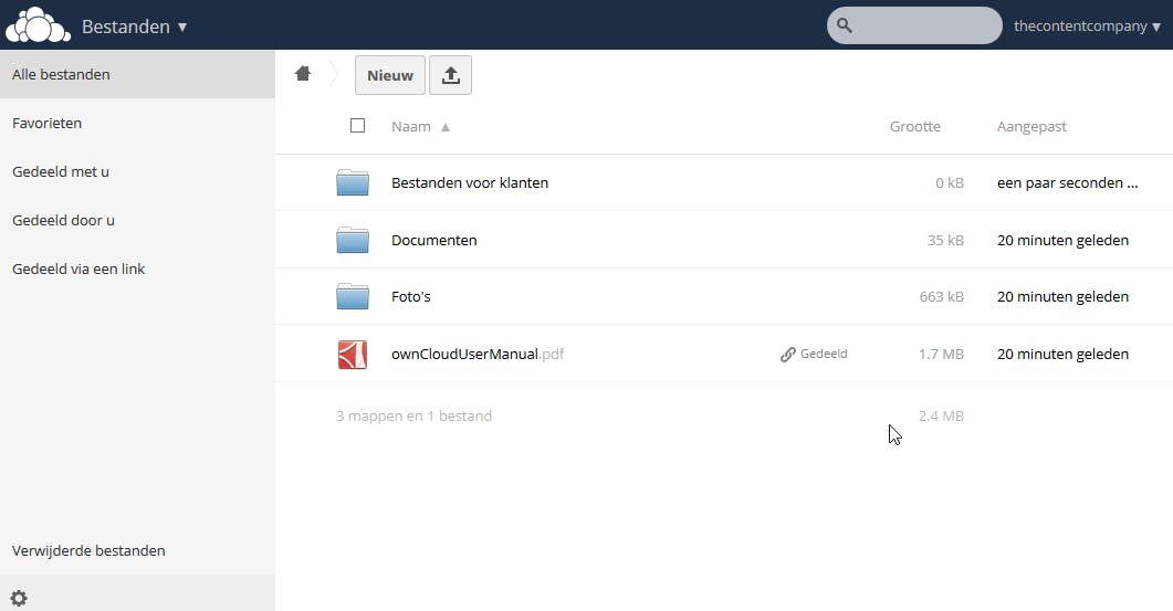 Je komt nu voor het eerst in de ownCloud omgeving terecht. Hier kun je – via de browser – bestanden beheren, uploaden of downloaden en delen. Het is ook mogelijk om andere gebruikers aan te maken en deze bepaalde rechten toe te kennen. Handig voor vrienden, klanten of mensen waarmee je in een club of stichting samenwerkt. Iedereen heeft toegang tot zijn of haar bestanden door even naar jouweigendomeinnaam.nl/ownCloud/ te surfen en in te loggen.