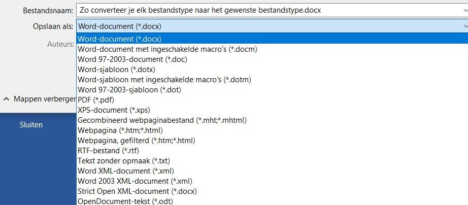 Het bestand waarin je het document gemaakt hebt, geeft je vaak de mogelijkheid om het als een andere bestandsindeling op te slaan. In Word kun je bijvoorbeeld onder ‘opslaan als’ de bestandsindeling wijzigen naar bijvoorbeeld een PDF-document of een txt-bestand. Dit wordt gedaan zodat het bestand in een andere programma, of een oudere versie van een programma, te openen is. Dit zorgt er wel voor dat een aantal functies niet meer werken. Dit kan bijvoorbeeld het automatisch opslaan zijn van Word-documenten.