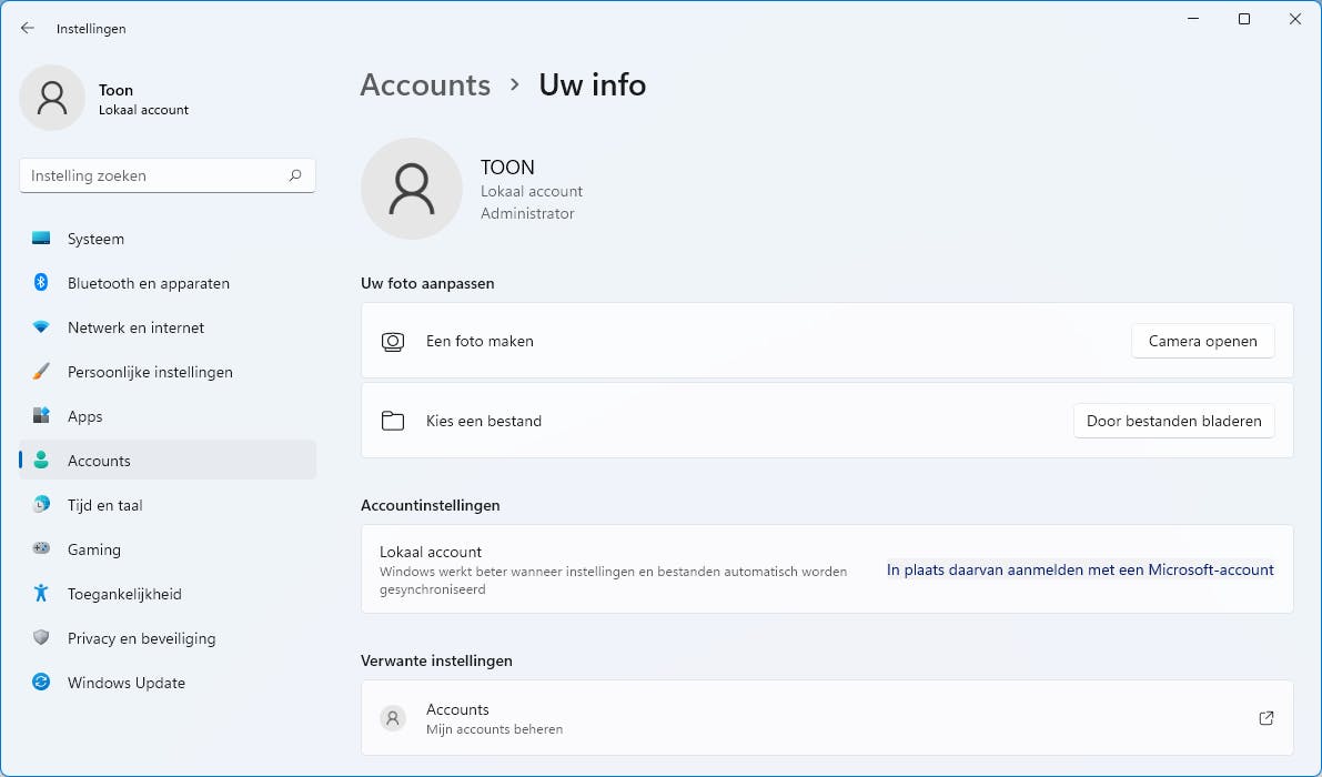 Aangezien Microsoft je al tijdens de installatie in de richting van een Microsoft-account duwt, is de kans groot dat je eigen account ook van dit type is. Op zich is dat geen probleem, maar je moet er wel voor opletten dat je persoonlijke bestanden dan niet automatisch in OneDrive worden opgeslagen – tenzij je dit niet erg vindt natuurlijk. Je kunt je account op elk moment nog omzetten in een lokaal account als je dit wenst. Open opnieuw Instellingen / Accounts / Uw info en klik op In plaats daarvan aanmelden met een lokaal account en volg de verdere instructies. Even later kun je je dan met een lokaal (administrator)account aanmelden.