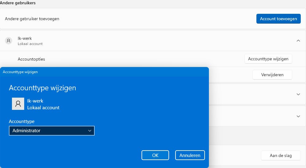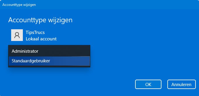 Uit veiligheidsredenen zou je je voor dagelijks gebruik overigens toch het best met een standaardaccount moeten aanmelden. Immers, zo’n account geef malware of hackers minder speelruimte.