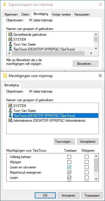 Klik nu in Verkenner met rechts op de mapnaam, kies Eigenschappen en open het tabblad Beveiliging. Vervolgens klik je op Bewerken en op Toevoegen. Bij Geef de objectnamen op vul je de exacte naam (of het e-mailadres) van het account in dat je toegang tot de map wilt geven. Zodra je op Namen controleren klikt, wordt de volledige aanmeldnaam ingevuld. Bevestig met OK en met Toepassen. Selecteer het account bij Namen van groepen of gebruikers en plaats bij Machtigingen voor <accountnaam> een vinkje bij Volledig beheer in de kolom Toestaan. Wil je een ander account alleen leesrechten geven, dan herhaal je deze procedure voor dat account, maar plaats je alleen een vinkje bij Lezen en uitvoeren, Mapinhoud weergeven en Lezen. Accounts die je de toegang wilt ontzeggen, voeg je simpelweg niet toe.