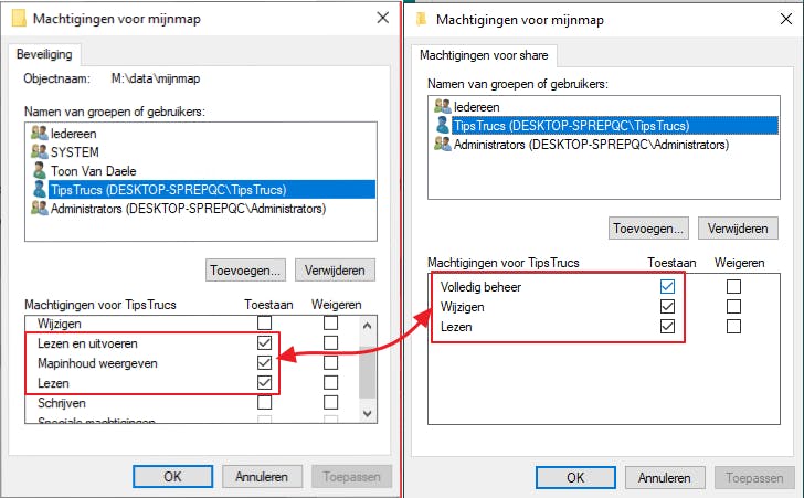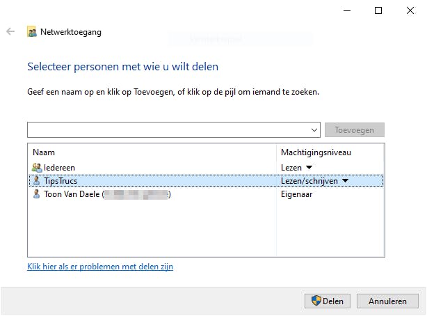 De machtigingen die we in de vorige tip hebben toegekend werken enkel op lokaal niveau (NTFS). Maar wat als je ook toegang wilt geven aan medegebruikers die vanaf een andere pc via je thuisnetwerk de map willen benaderen? Dan moet je nog share-machtigingen instellen (gedeelde netwerkmappen worden dus ook wel ‘shares’ genoemd) en dit vergt enige voorbereiding.