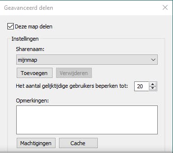 Plaats een vinkje bij Deze map delen en vul een naam voor je gedeelde map in. Handig om weten: als je deze naam afsluit met het teken $, dan wordt de gedeelde map standaard niet zichtbaar in de netwerkomgeving van de andere pc’s.