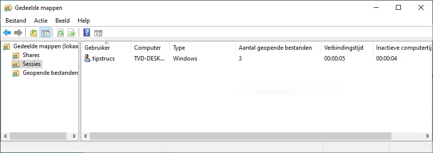 Een handige beheertool is verder nog Gedeelde mappen. Je opent deze door Windows-toets+R in te drukken en het commando fsmgmt.msc uit te voeren. Ook hier krijg je een overzicht van de shares, evenals van de actieve deelsessies en de geopende bestanden.