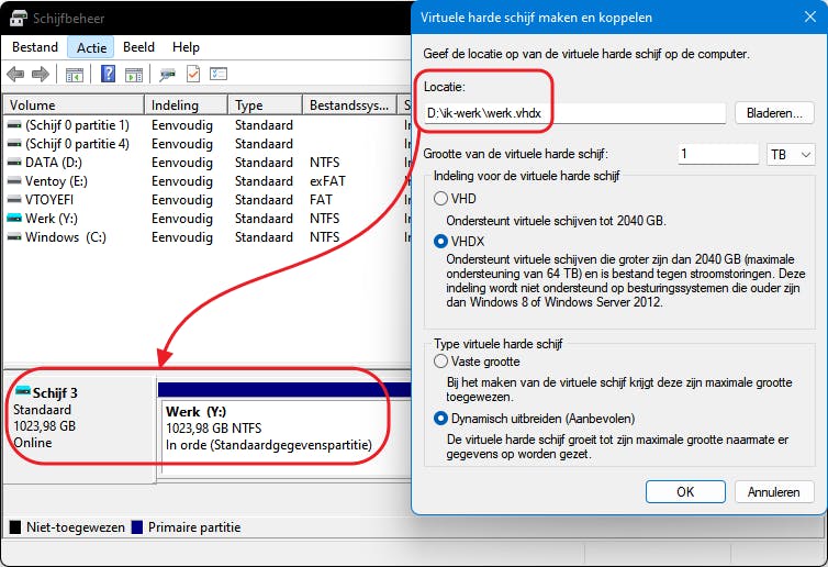 In Windows Pro gaan we aan de slag met een virtuele harde schijf. Maak alvast een map, druk op Windows-toets+R en voer diskmgmt.msc uit. Selecteer de betreffende partitie en kies Actie / Virtuele harde schijf maken. Selecteer VHDX, verwijs via Bladeren naar de zojuist gemaakte map en noem je virtuele schijf bijvoorbeeld werk.vhdx. Stel de maximale schijfgrootte in (bijvoorbeeld 1 TB), maar laat de optie Dynamisch uitbreiden (aanbevolen) bij voorkeur geselecteerd, zodat de schijf met je actuele behoefte meegroeit tot het ingestelde maximum. Bevestig met OK.