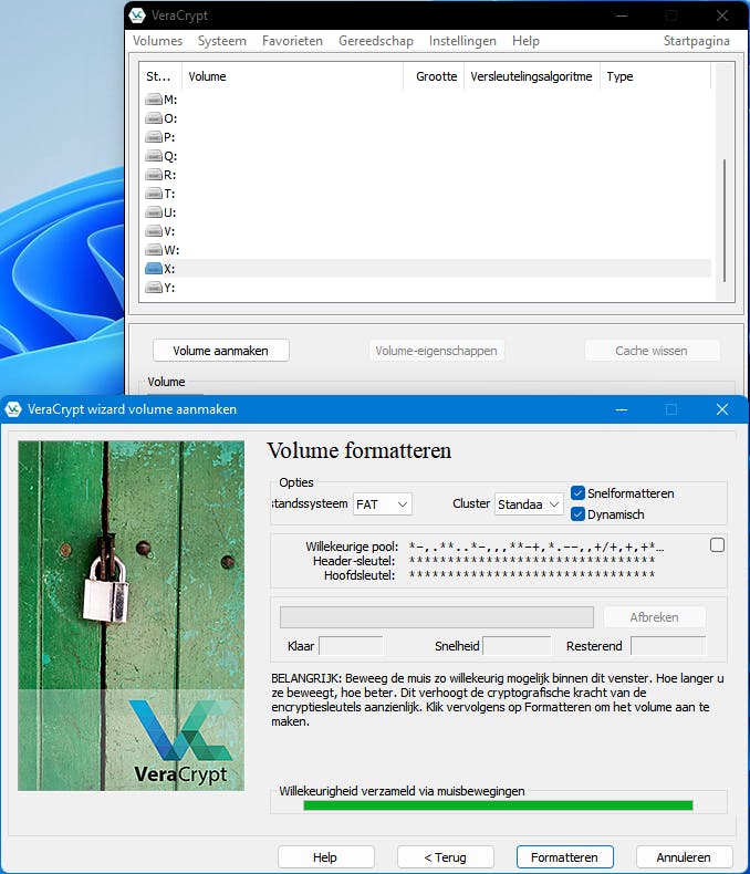 Klik op Volume aanmaken. Kies Een versleutelde bestandscontainer aanmaken, druk op Volgende, laat Standaard VeraCrypt-volume geselecteerd en druk op Volgende. Druk op Bestand selecteren, navigeer naar een geschikte locatie en vul de naam van een (niet-bestaand) bestand in, bijvoorbeeld veracrypt-container.txt. Bevestig met Volgende (2x) en vul een maximumgrootte in. Druk op Volgende en vul tweemaal een wachtwoord in. Druk nogmaals op Volgende, selecteer Ja als je bestanden groter dan 4 GB wilt kunnen opslaan, druk op Volgende en beweeg de muis tot de balk groen kleurt. Plaats eventueel een vinkje bij Snelformatteren en bij Dynamisch. Deze laatste optie zorgt ervoor dat je virtuele schijf zal meegroeien met de data die je erin plaatst; houd er wel rekening mee dat dit tot mindere prestaties kan leiden. Druk op Formatteren en bevestig na afloop met OK en met Sluiten.