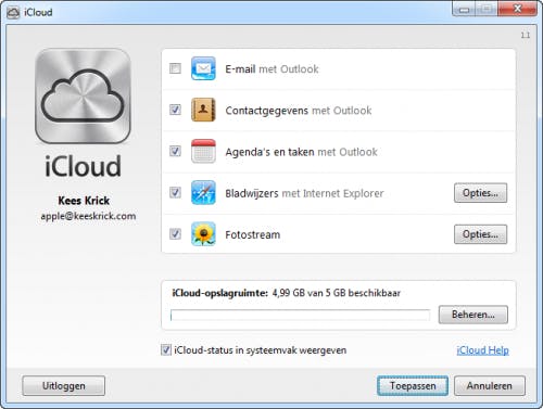 Wie een iPad en een iPhone heeft, kan allerlei gegevens tussen deze apparaten synchroniseren via iCloud. Het is een eenvoudige manier om het adresboek en de agenda consistent te houden, maar bijvoorbeeld ook de Safari-favorieten en foto's die met de mobiele gadgets gemaakt zijn uit te wisselen. Het synchroniseren werkt via internet en kan uiteraard ook met een Mac en zelfs met de iPod touch. Apple heeft zelfs aan de pc-gebruiker gedacht. Met een gratis programma kan een gewone Windows-pc op iCloud aangesloten worden. Deze software heet het iCloud-configuratiescherm (iCloud Control Panel for Windows) en is geschikt voor Windows Visa SP2 en Windows 7. Ga naar http://ct.link.ctw.nl/icc, klik op Download om het bestand iCloudSetup.exe binnen te halen en voer het uit. Zodra u de installatiestappen doorlopen hebt, is het moment aangebroken om aan te geven wat u via iCloud wilt synchroniseren. Dit instellingenscherm verschijnt vanzelf zolang u onderin het welkomstscherm het vinkje bij Configuratiescherm iCloud openen laat aanstaan.